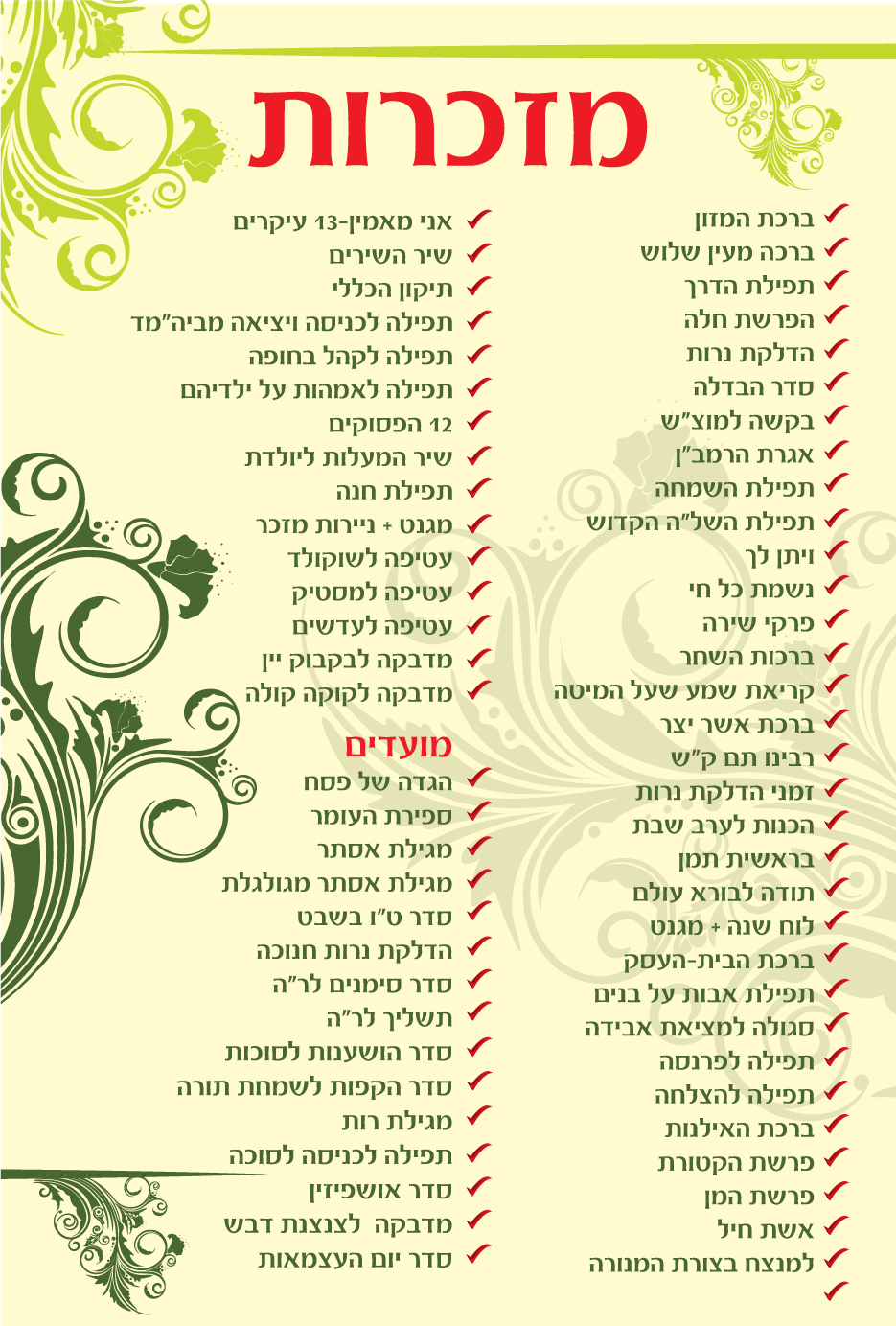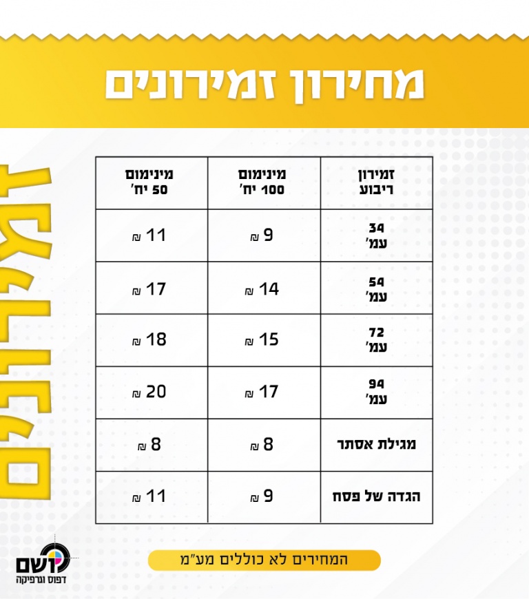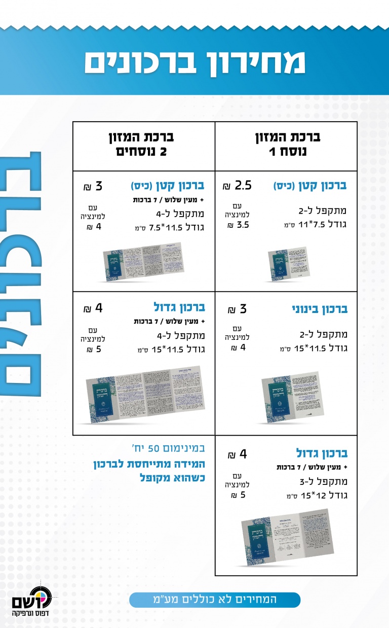 זמירונים, ברכונים, מספרי שולחן, כרטיסי הושבה, שלטים לחדרים, פולדר, ברכת הדלקת נרות, לו"ז לשבת, חבקים למפיות/צלחות, חבקים לבקבוקים, עטיפה לשוקולד, שלט ברוכים הבאים, רולאפ, פלייסמנט, סימניות, פתקית חירור, מדבקות עגולות/מרובעות, כרטיסי תודה, מדבקה לקופסת גפרורים, תפילה, ברכה, פרק תהילים, גלויה, מגנט, ועוד…