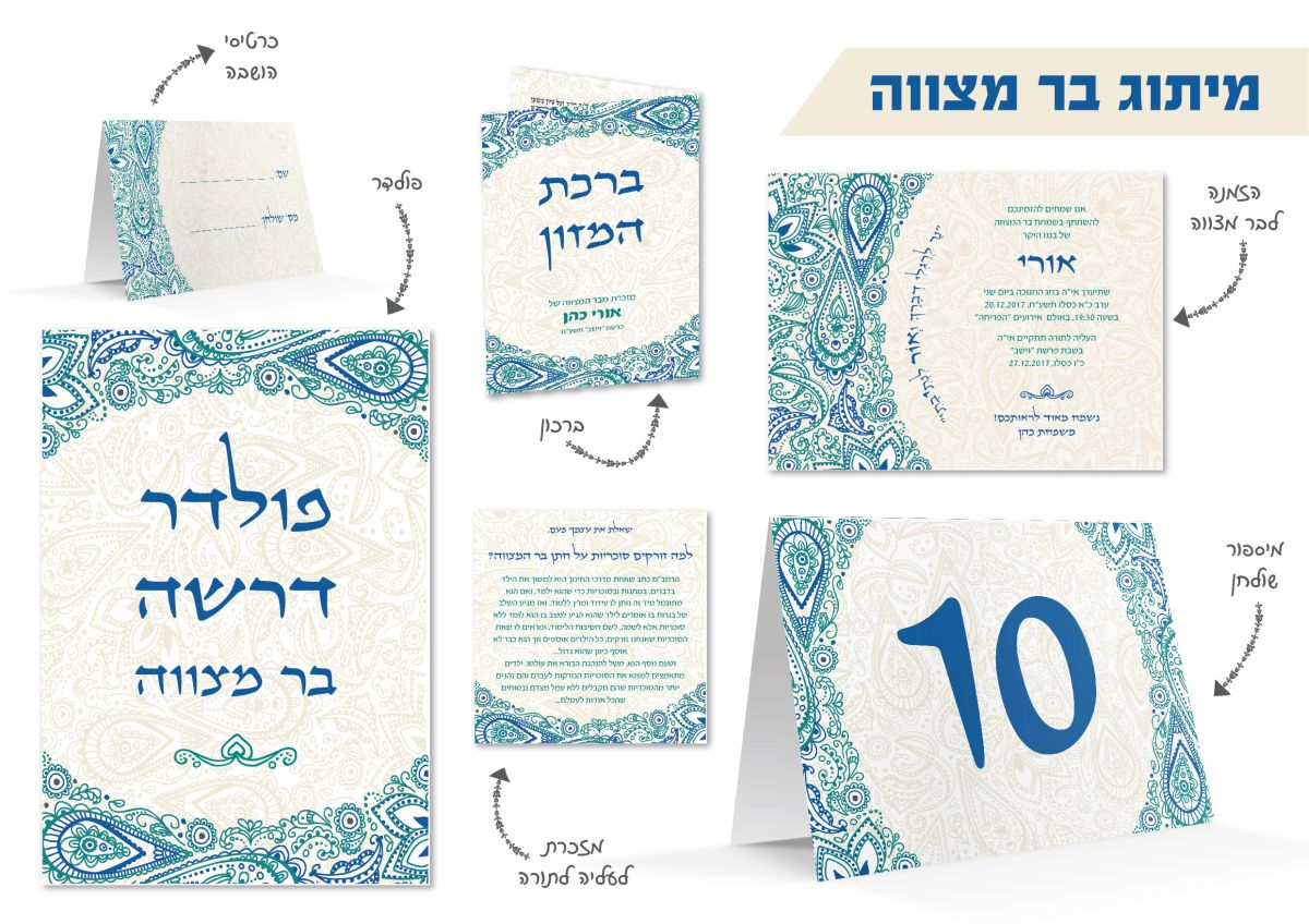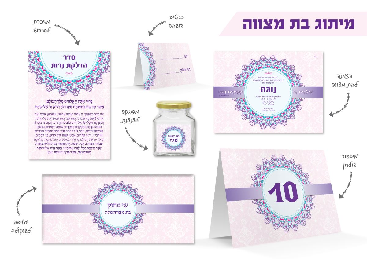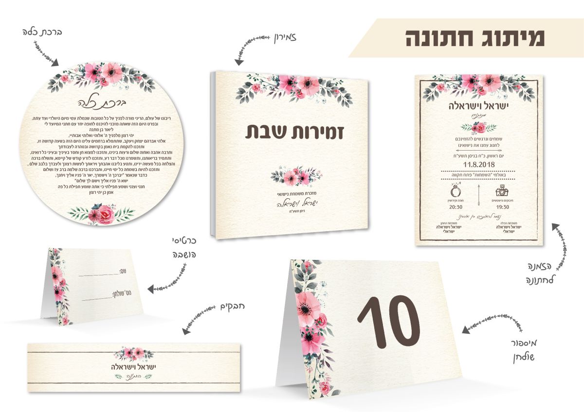 חבילת מיתוג לכל אירוע הכולל הזמנה לאירוע, מספור שולחן, ברכון, פולדר, כרטיסי הושבה ועוד.